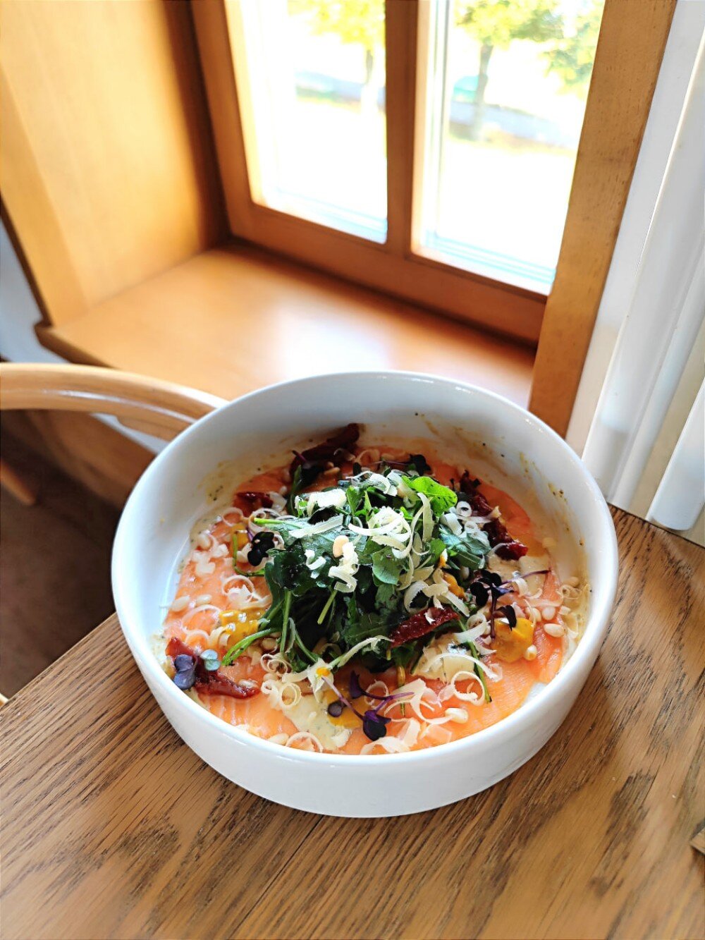 Лосось, сливочный соус, апельсиновый соус, руккола, вяленые томаты, кедровый орех, пармезан